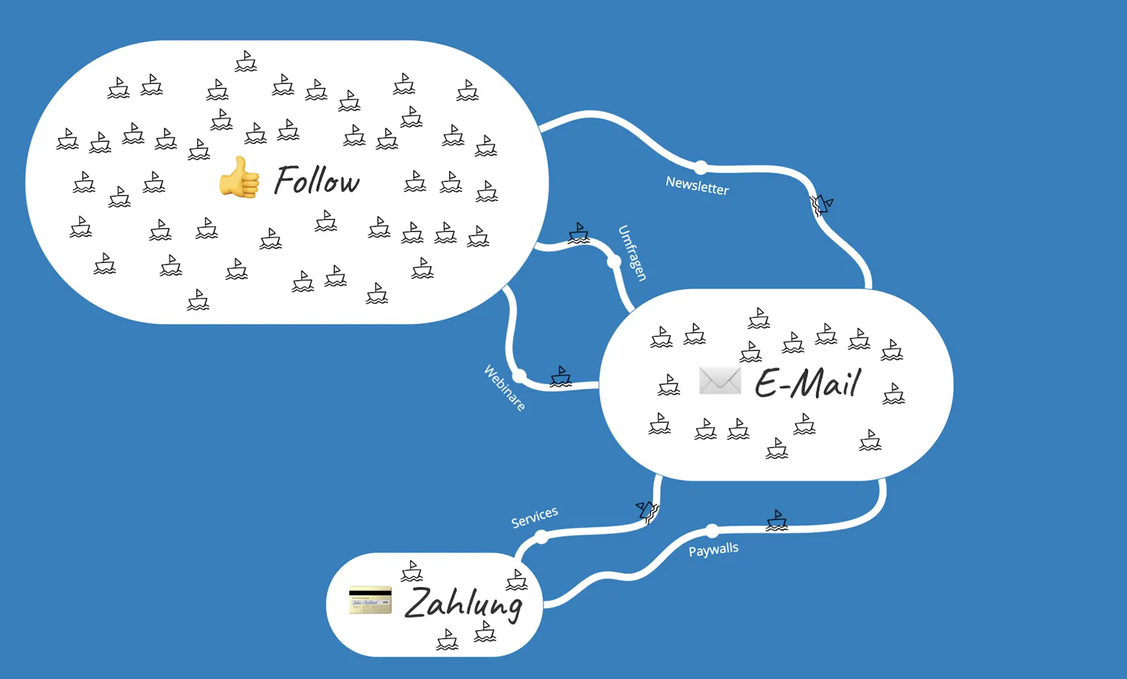 Die Leute geben dir ihr Geld nicht, sobald sie zum ersten Mal in Kontakt mit deinem Angebot kommen. Zunächst mal lesen, sehen, hören sie irgendwas. Dann bleiben sie eventuell in Kontakt, indem sie dir in sozialen Medien folgen. Nach einer Weile geben sie dir freiwillig ihre E-Mail-Adresse. Und nochmal später sind sie vielleicht bereit, zu zahlen.
