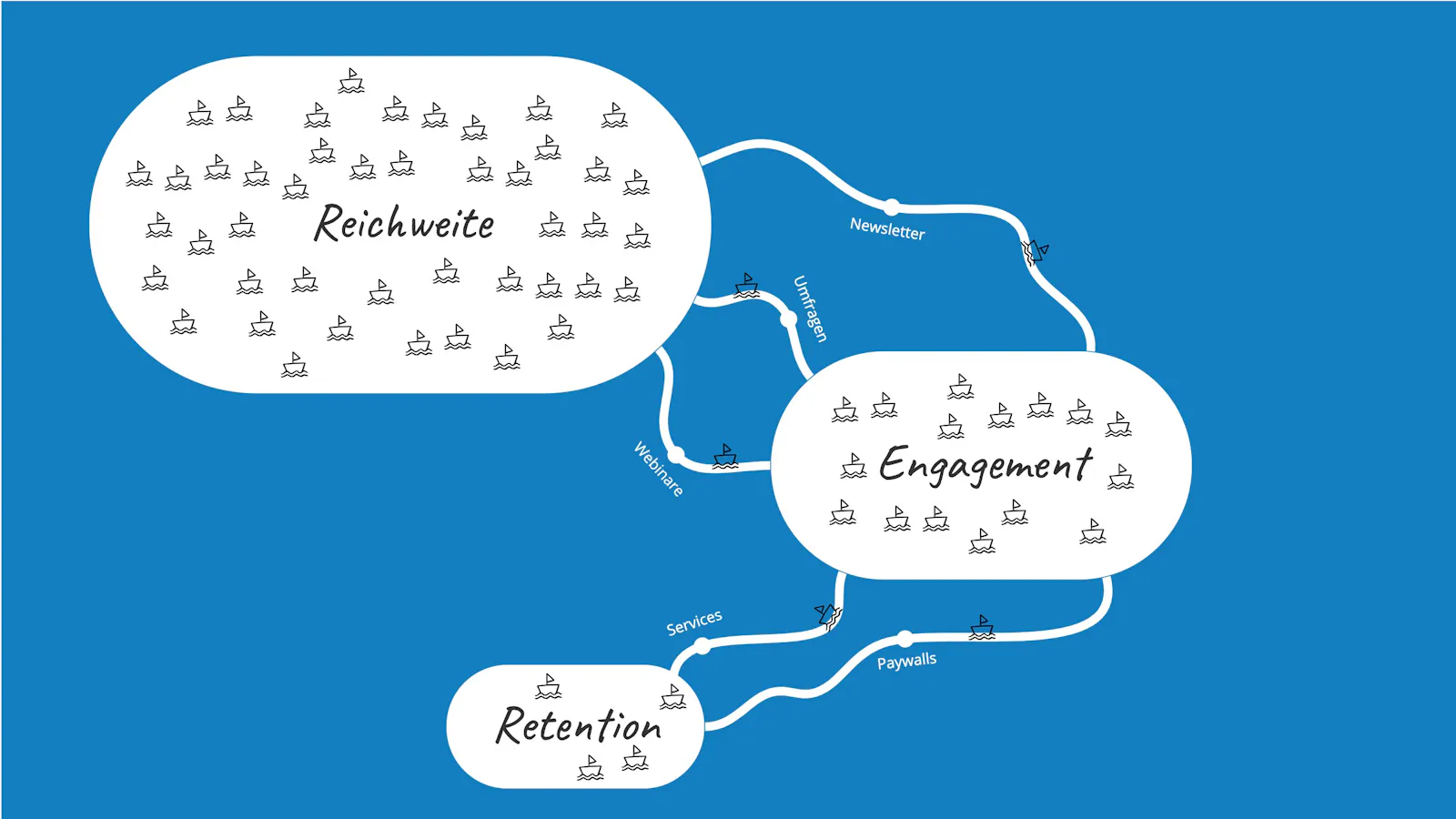 Stell dir es dir vor wie eine Reihe von verbundenen Seen. Es ist dein Job, jeden dieser Seen so gut es geht mit Schiffchen zu füllen. Damit ein Schiff im Mitgliedschafts-See ankommt, muss es durch die beiden größeren Seen durch. Das passiert aber nicht von allein. Du musst es durchschleusen. Nur dann wirst du Geld verdienen.