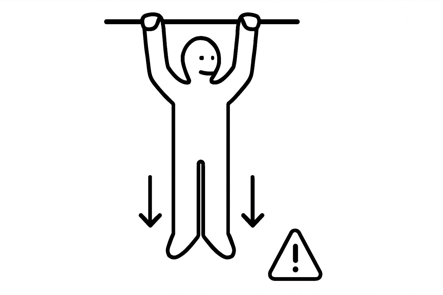 (Öffnet in neuem Fenster)Wem das wider Erwarten nicht gelingen sollte, dem möchte ich eine mir besonders sympathische Übung namens Dead Hang (freies Hängen) empfehlen. Im Grunde baumelt man sich selbst mit seinem Körpergewicht – ähnlich einem nassen Pyjama – an einer Wäscheleine an die besagte Stange. Das verbessert die Griffkraft, fördert die Schultergesundheit und dekomprimiert die Wirbelsäule. Hier dargestellt von einer KI im Stil von IKEA-Anleitungen.