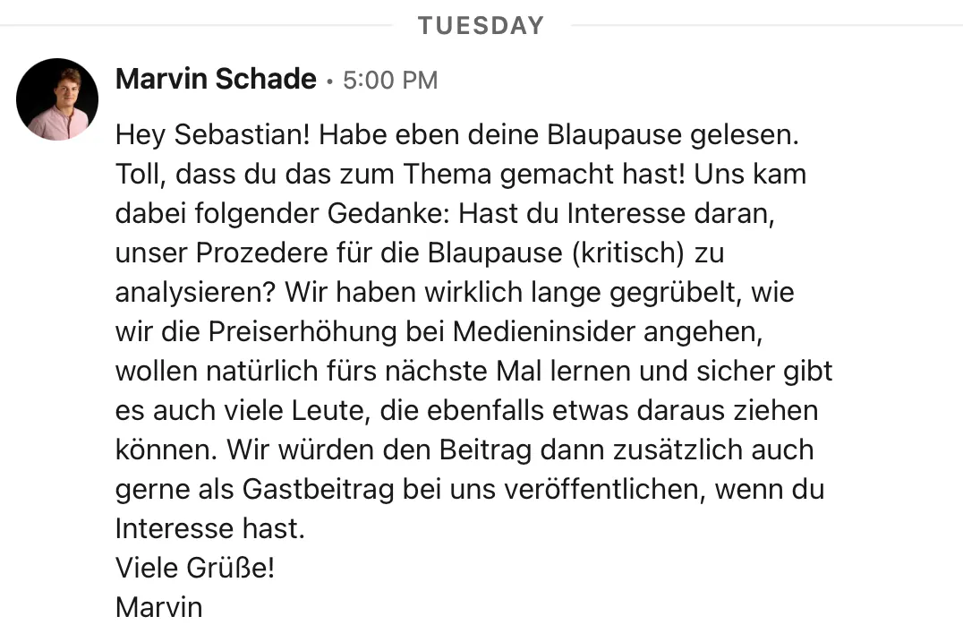 In der vergangenen Blaupause habe ich Tipps zum Preise Erhöhen gegeben. Auslöser war – ihr erinnert euch vielleicht –, dass Marvin Schade, Gründer des Branchendienstes Medieninsider (Öffnet in neuem Fenster), gefragt (Öffnet in neuem Fenster) hatte, wie man Preiserhöhungen am besten kommuniziert.