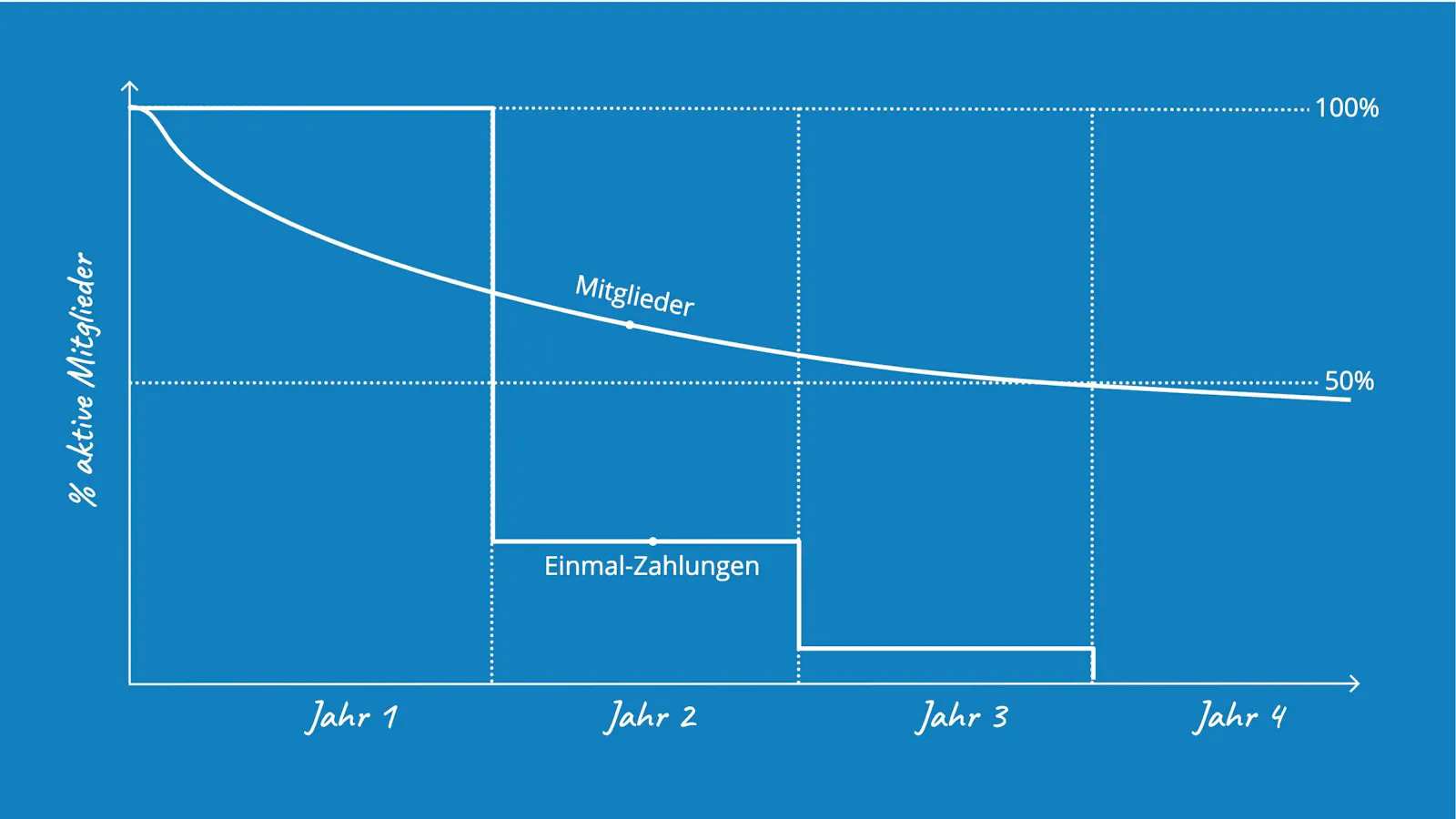 Ganz anders bei Einmalzahlungen. Jemand, der Dir 5 Euro überweist, tut das mit besten Absichten und wird zu Recht sagen können, dir geholfen zu haben. Allerdings wird die Person das im Normalfall genau einmal tun, schließlich hat sie dieses gute Gefühl (“ich habe das Projekt unterstützt”) ja schon bekommen. Du musst große Anstrengungen unternehmen, um so jemanden zu einer erneuten Zahlung zu bewegen. Um mit dieser Methode auf 180 Euro zu kommen, müsstest du das bei 36 Menschen schaffen! Statt ein einziges neues Mitglied zu gewinnen.