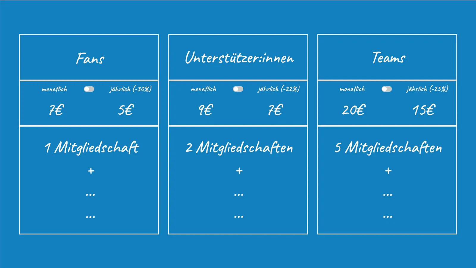 Wenn du dir nach all dem immer noch nicht sicher bist, nimm einfach diesen Preis: 5 Euro für einen Jahresmitgliedschaft. Die Erfahrung zeigt, dass fast jede Zielgruppen diesen Betrag okay findet. Das ist nicht zuviel und nicht zu wenig. Lass die beiden anderen Pakete erstmal weg und verlange 7 Euro bei monatlicher Zahlung. Zack.