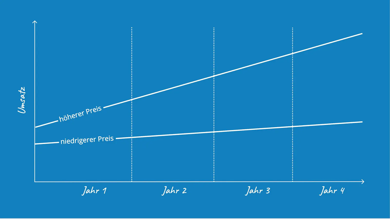 Du solltest dir auch von Anfang an klar machen, welche Auswirkungen ein zu niedriger Preis langfristig auf deinen Umsatz haben wird. Anfangs scheint der Unterschied zwischen 4,50 und 6 Euro noch nicht besonders ins Gewicht zu fallen. Je mehr Mitglieder du hast und je länger du einen Preis beibehältst, desto mehr Geld verlierst du aber. Und desto mehr Energie wirst du in Marketing und Gegenleistungen investieren müssen, um auf einen ähnlichen Umsatz zu kommen, als wenn du von Anfang an einen höheren Preis angesetzt hättest.