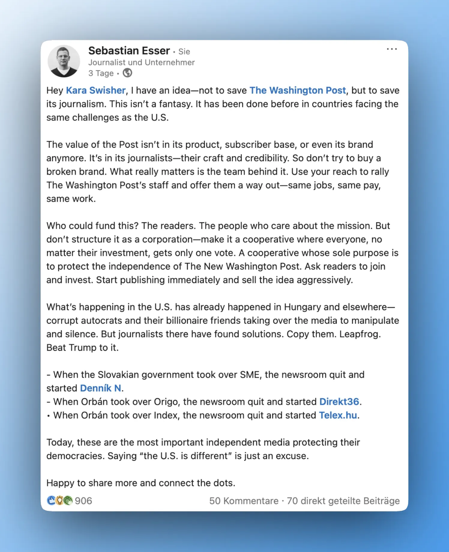Für freie Medien eine düstere Perspektive. Oft übernehmen in so einem System regierungsnahe Oligarchen etablierte Medien, wie eben Bezos die Post. Ähnliche Probleme bedeuten aber auch: ähnliche Lösungen. Es gibt tatsächlich viele Beispiele, bei denen Journalist:innen nach einer feindlichen Übernahme eines Mediums oder einem Redaktions-Walkout ein neues digitales Medium gegründet haben. Daruas gibt es einiges zu lernen. Besonders in Osteuropa, Lateinamerika und Asien sind solche unabhängigen Medien entstanden. Viele davon sind als Genossenschaften oder anderen alternativen Eigentumsmodellen organisiert, um erneute Einflussnahme zu verhindern.