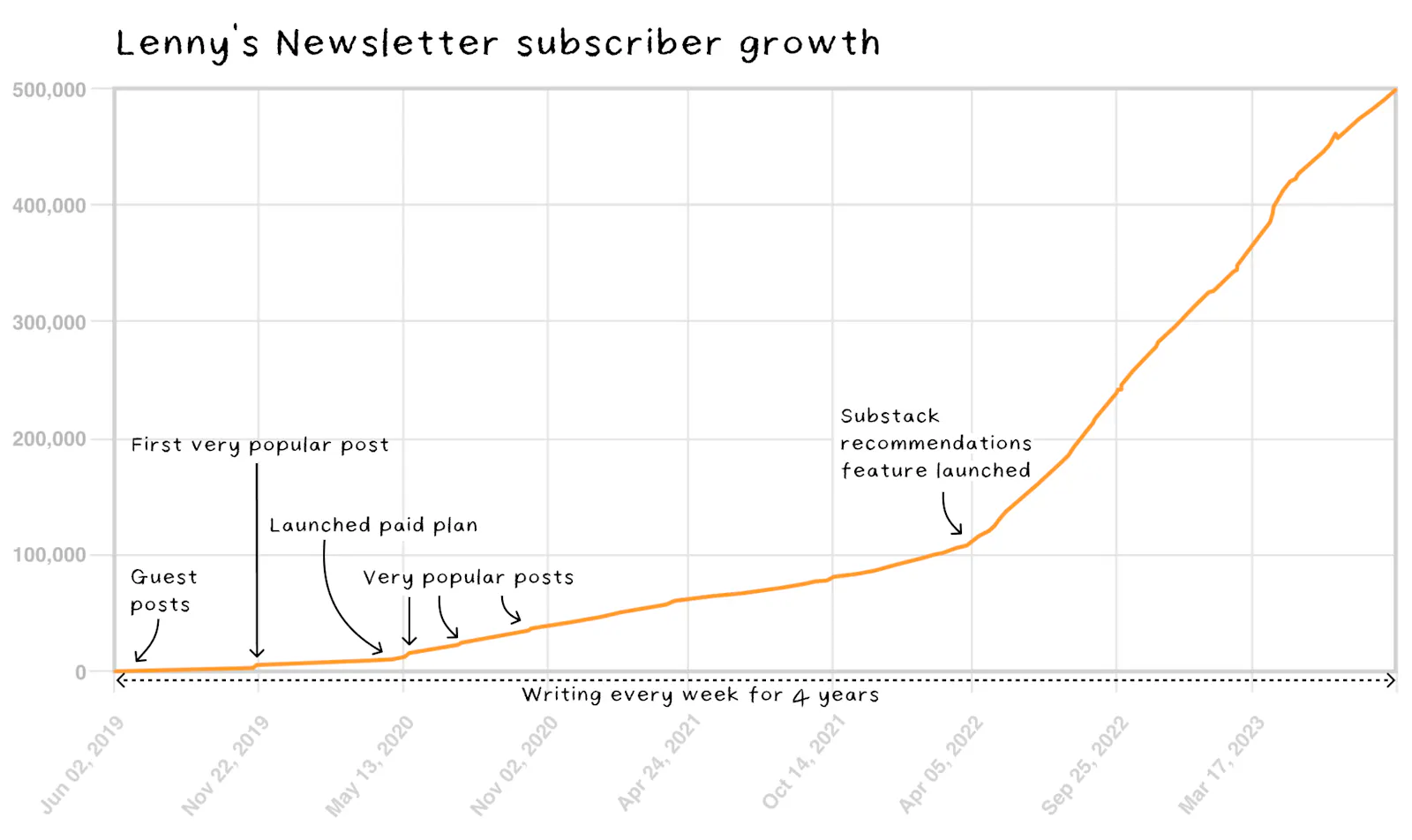 Das änderte sich vor zwei Jahren, als zuerst der US-Newsletter-Anbieter Substack ein sogenanntes Recommendation Feature einführte, und auf diese Weise das Subscriber-Wachstum seiner Newsletter ins Produkt einbaute, und zwar erfolgreich. Dieser Hebel-Effekt erwies sich bei vielen Substack-Autoren als effektiv. Lenny Rachitsky zum Beispiel, der einen großen Newsletter für Produkt-Manager von Digital-Produkten betreibt (Lenny’s Letter (Öffnet in neuem Fenster)), legte im Herbst seine Zahlen offen (Öffnet in neuem Fenster). Darin ist ein deutlicher Knick nach oben zu erkennen: