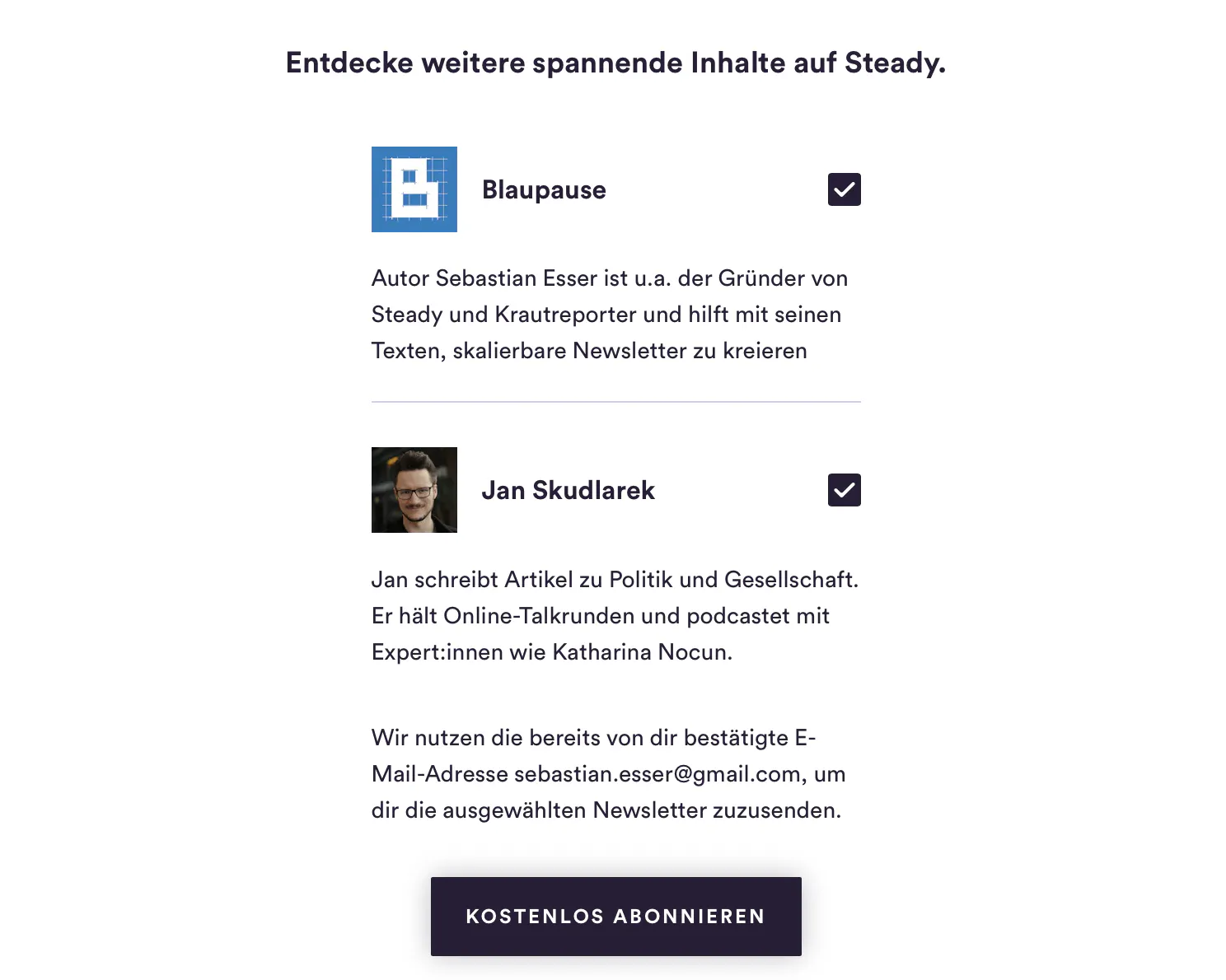¹ Falls du den Eindruck hast, ich mache hier Werbung für das eigene Produkt, tut mir das leid, ist aber schwer zu vermeiden. Ich vermeide Verkaufssprech und erzähle keinen Quatsch, Blaupause funktioniert auch ohne jedes Interesse an Steady. Allerdings bin ich nun mal für Steady verantwortlich und freue mich natürlich über Interesse, kostenlos einen Newsletter bei Steady zu starten.