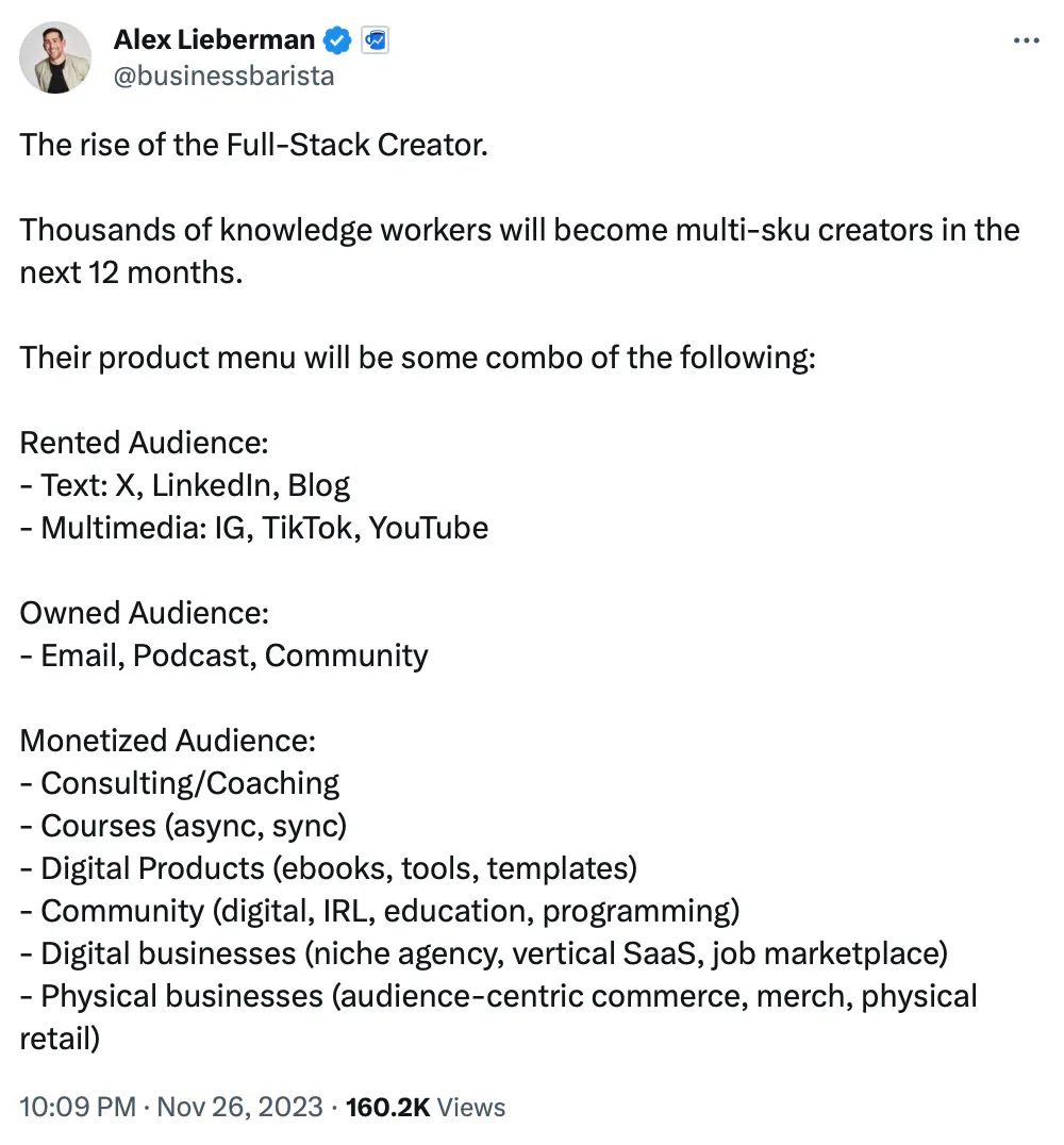 Was Alex Lieberman, Gründer des ultra-erfolgreichen Newsletters Morning Brew, „full stack creators“ nennt, sind für mich die Reinform eines modernen Medienunternehmens. Klein und flexibel genug, um die unaufhörlichen Veränderungen der digitalen Öffentlichkeit mitzumachen, schnell aufzubauen bei niedrigen Kosten, dadurch auch schnell profitabel selbst für kleine User-Communitys.
