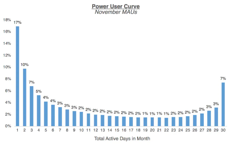 Ein Konzept, welches hilft erfolgreiche App-Strategien zu beurteilen, ist die sogenannte Power-User-Kurve. Facebook führte diese ein, um das Nutzerverhalten systematisch zu analysieren und gezielt Anreize zu schaffen, damit Nutzer häufiger und intensiver mit der Plattform interagieren. Die Power-User-Kurve half dabei, besonders aktive Nutzer zu identifizieren (also alle, die sich weit rechts auf der Skala befanden und die App mindestens 25 Tage/Monat nutzten) und ihr Verhalten auf breitere Nutzergruppen zu übertragen, was das Wachstum und die Bindung stark beschleunigte und Facebooks Erfolg nachhaltig förderte. Sie war 2006 eng mit der Einführung des News-Feeds verbunden. Mehr dazu hier. (Öffnet in neuem Fenster)