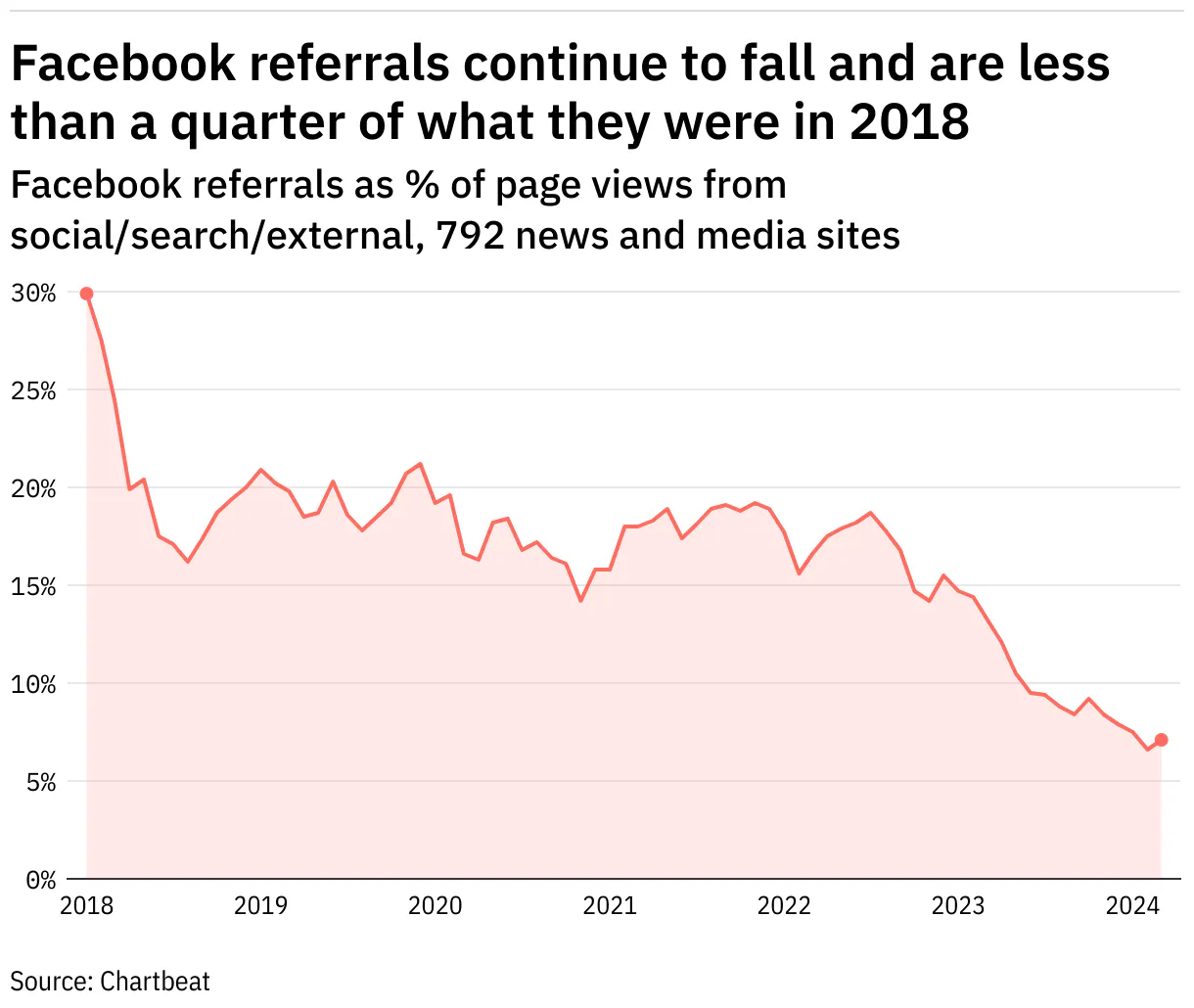 Das Branchen-Medium Pressgazette berichtet von neuen Daten (Öffnet in neuem Fenster) der Analytics-Services Chartbeat und Similarweb über der Traffic, den Facebook etwa 800 Publishern sendet. Seit dem vergangenen Frühjahr bricht er geradezu ein, und der Abwärtstrend hält weiter an: