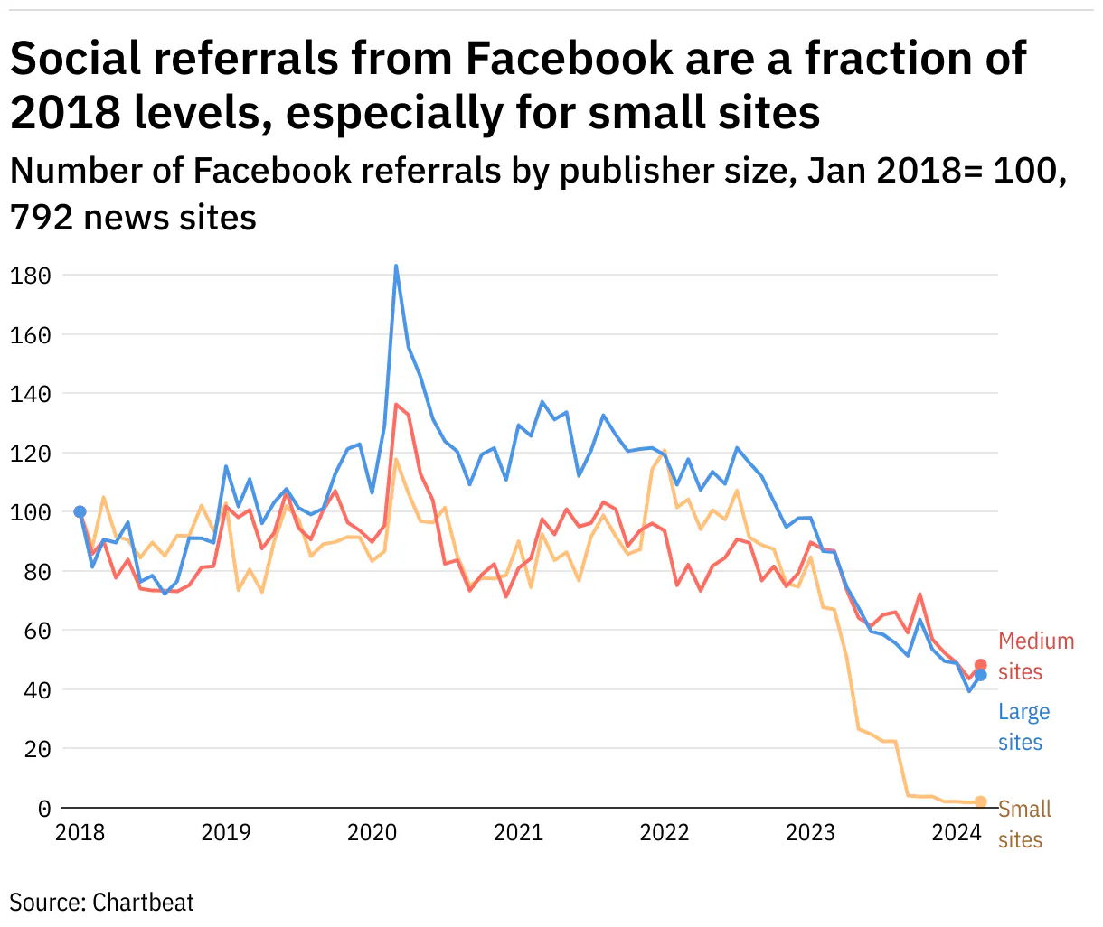 Besonders hart betroffen sind die kleinen Medien im Daten-Sample. Bei denen geht der Facebook-Traffic inzwischen gegen null: