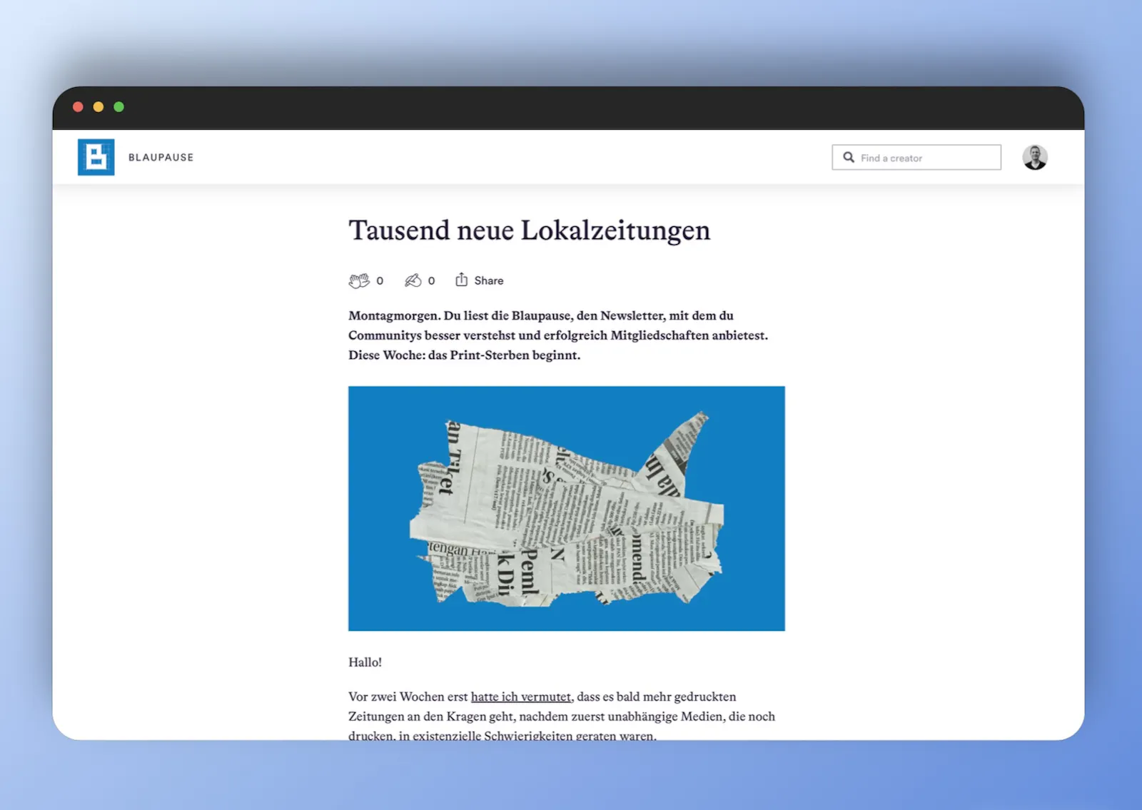Montagmorgen. Du liest die Blaupause, den Newsletter, mit dem du Communitys besser verstehst und erfolgreich Mitgliedschaften anbietest. Diese Woche: Wie die Blaupause via Spiegel eine Diskussion über Lokaljournalismus auslöste.
