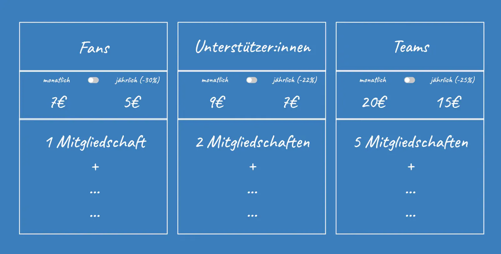 Nimm für den Anfang diesen Preis: 5 Euro für eine Jahresmitgliedschaft. Die Erfahrung zeigt, dass fast jede Zielgruppen diesen Betrag okay findet. Das ist nicht zu viel und nicht zu wenig. Lass andere Pakete erstmal weg und verlange 7 Euro bei monatlicher Zahlung. Zack.