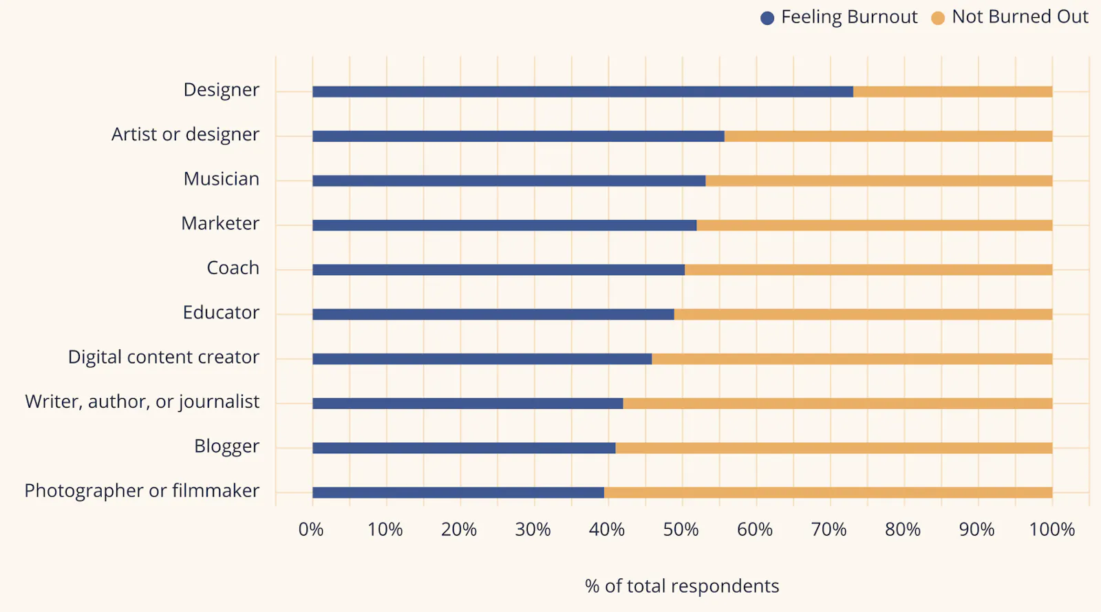 Zwar sank der Anteil der Creators, die schon Erfahrungen mit Burnout gemacht haben, im diesjährigen „State of the Creator Economy Report 2023 (Öffnet in neuem Fenster)“ um 14 Prozent, aber noch immer berichten 47 Prozent, dieses Problem zu kennen. Die meisten Betroffen sind Designer, Künstler und Künstlergruppen, jedoch betrifft es alle Segmente.