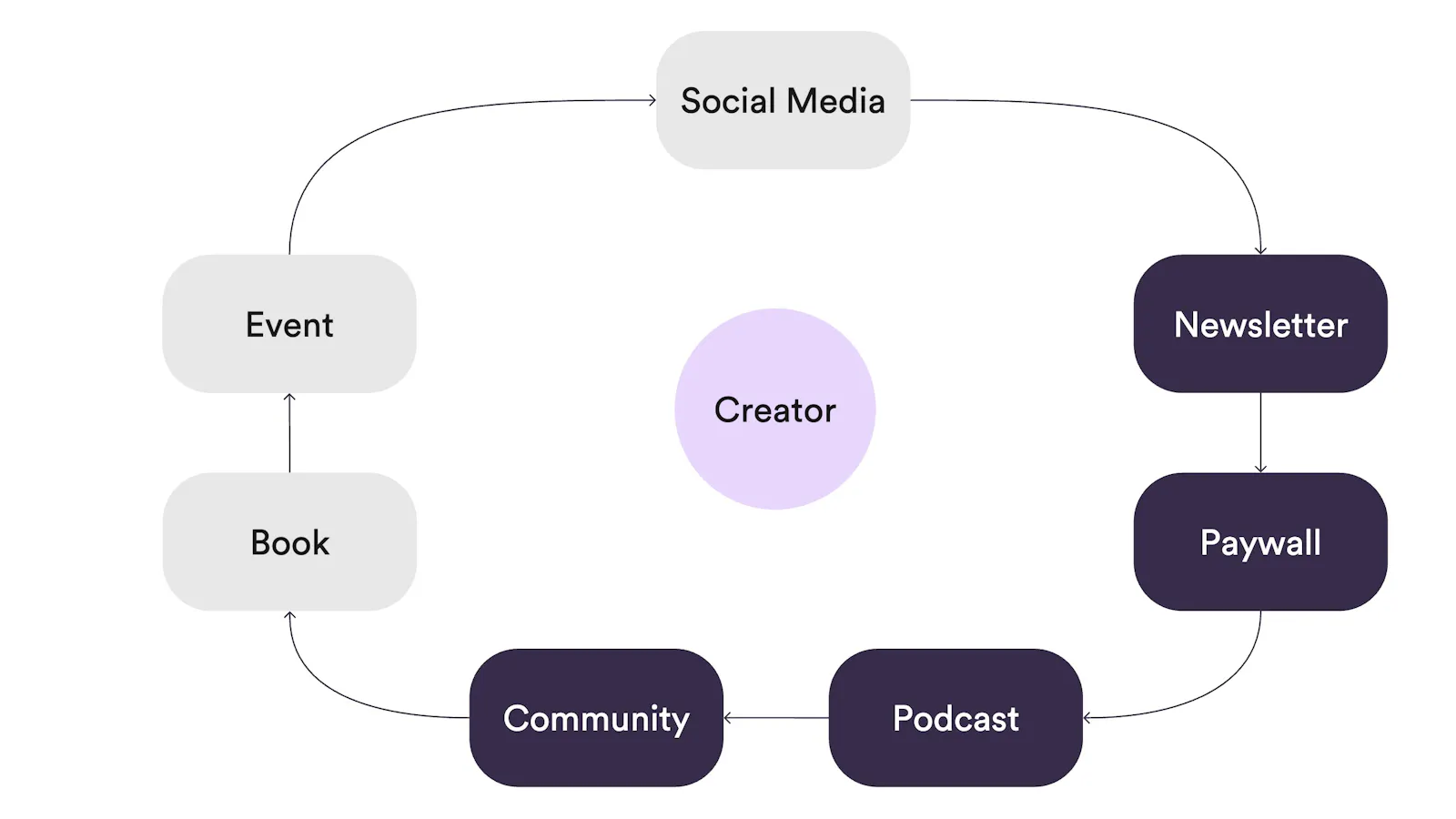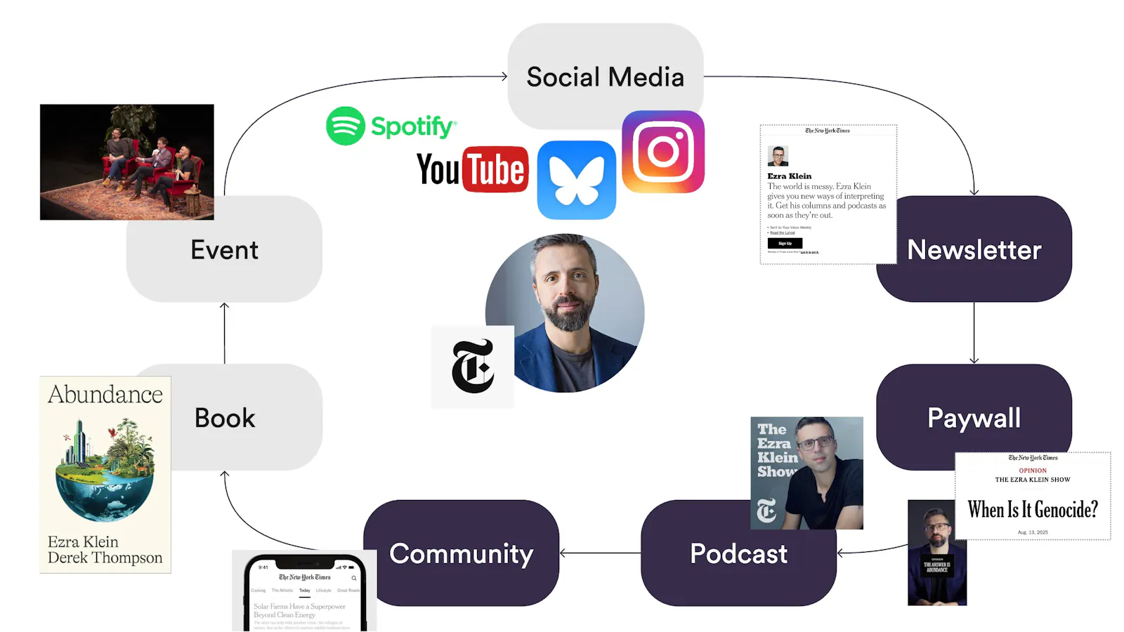 Dabei wäre es nicht besonders kompliziert, so ein Creator-Produkt mit eingebautem Wachstums-Flywheel zu konzipieren. Ein Kreislauf aus Social Media, Newsletter, Podcast, Paywall, Community, Büchern und Events eignet sich wunderbar, um aus einer geeigneten Personen-Marke ein profitables Geschäft zu machen. So sieht es zum Beispiel bei Ezra Klein von der New York Times aus.