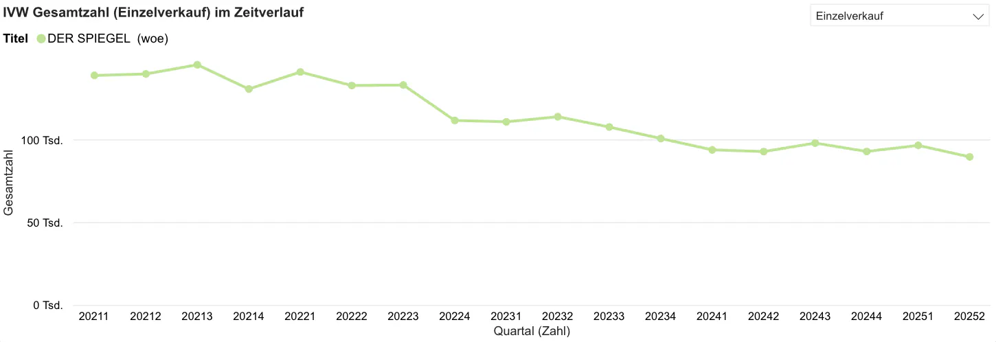 Nur die Abos sind stabil, dank knapp 260.000 digitaler Spiegel-Plus-Kund:innen, die in diese Gesamtzahlen branchenüblich reingemogelt werden – sie haben ja theoretisch Zugriff aufs sogenannte E-Paper, das im Alltag aber nur sehr wenige nutzen dürften. (Zum Vergleich: Die Steady-Publikationen haben zusammen genommen mehr als 260.000 Mitglieder.)