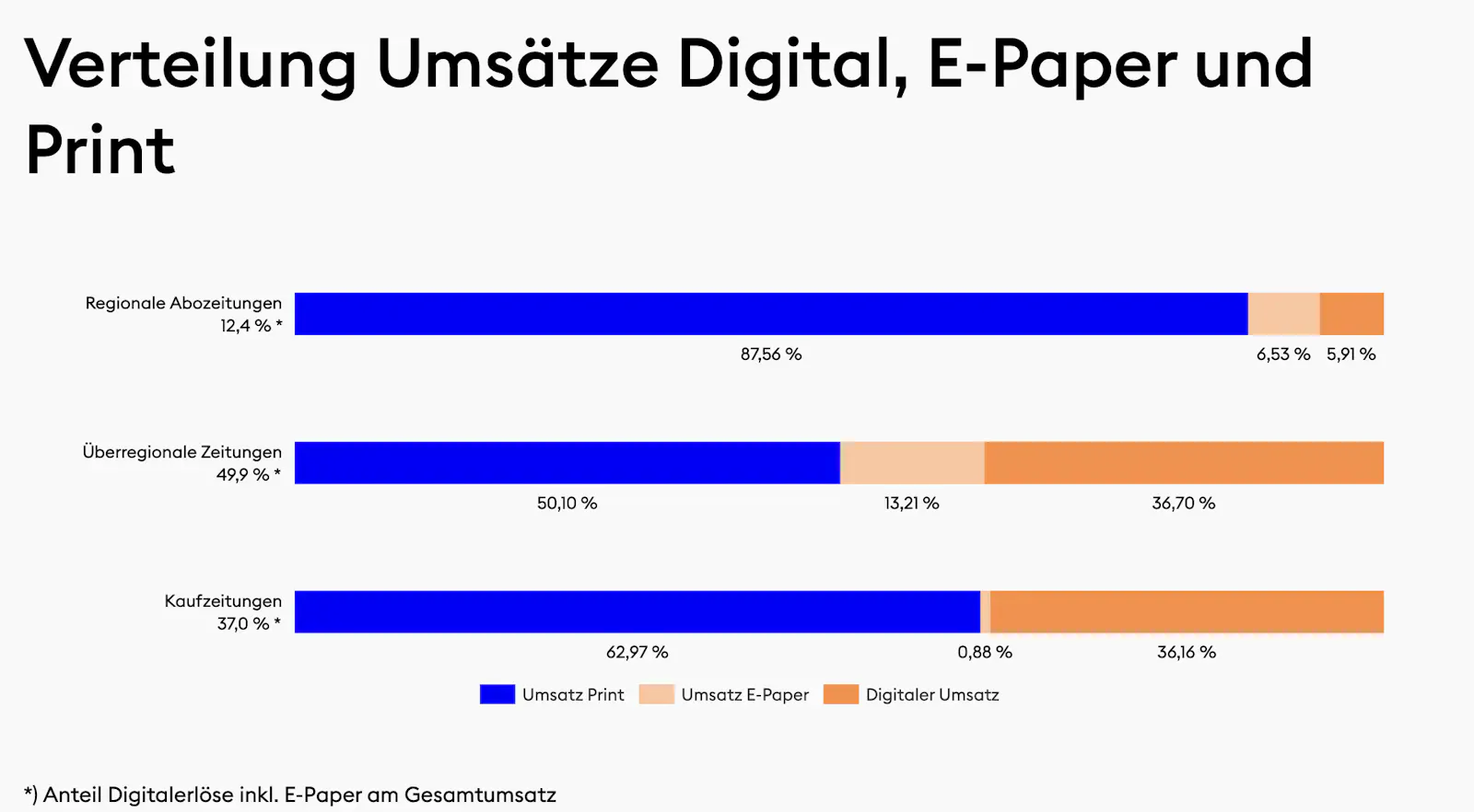 Das gilt besonders für die Regionalzeitungen, die ihre Umsätze immer noch zu fast 90 Prozent mit ihren Printprodukten erwirtschaften (siehe Grafik). Inzwischen sind diese Zeitungen so teuer, dass sie sich kaum noch jemand Im Einzelverkauf leisten will, und dass immer weniger Spätis, Lotto-Läden und Supermärkte sie anbieten. Ich jedenfalls habe ich neulich nicht geschafft, eine Zeitung zu kaufen.