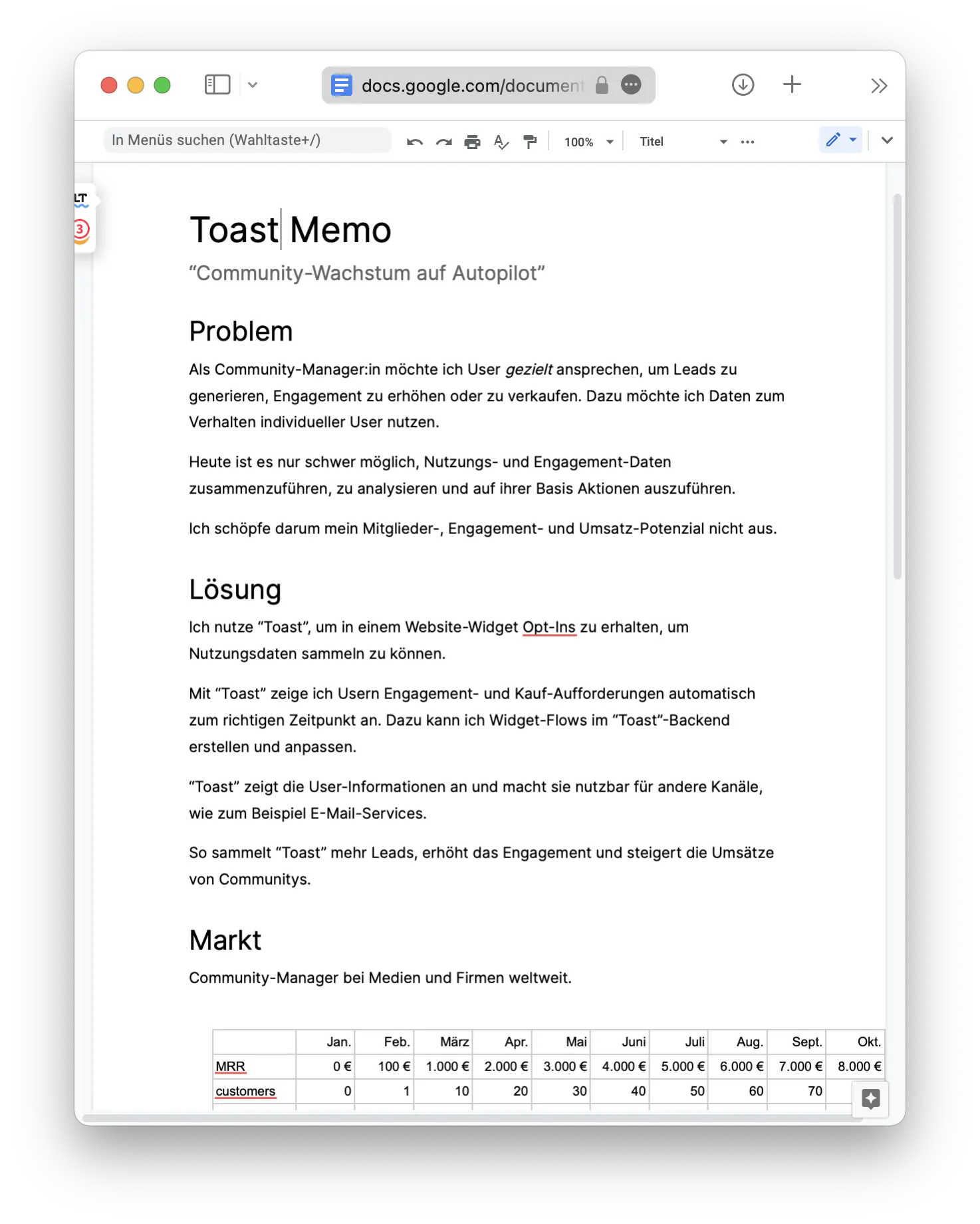 Ein Memo besteht aus drei Teilen: Problem, Lösung, Markt. Beschreibe so konkret wie möglich (kein Marketing-Bla-Bla) das Problem, das du lösen willst. Schreib dann in drei Sätzen auf, was konkret du dir ausgedacht hast. Das ist schwierig, vor allem, wenn du wirklich kritisch mit dir bist und lange genug redigierst. Beschreibe bei Markt, wie viele Leute es gibt, die dafür bezahlen werden. Überlege, wie viel sie dafür zahlen, und wie du ihnen von deinem Angebot erzählen willst.