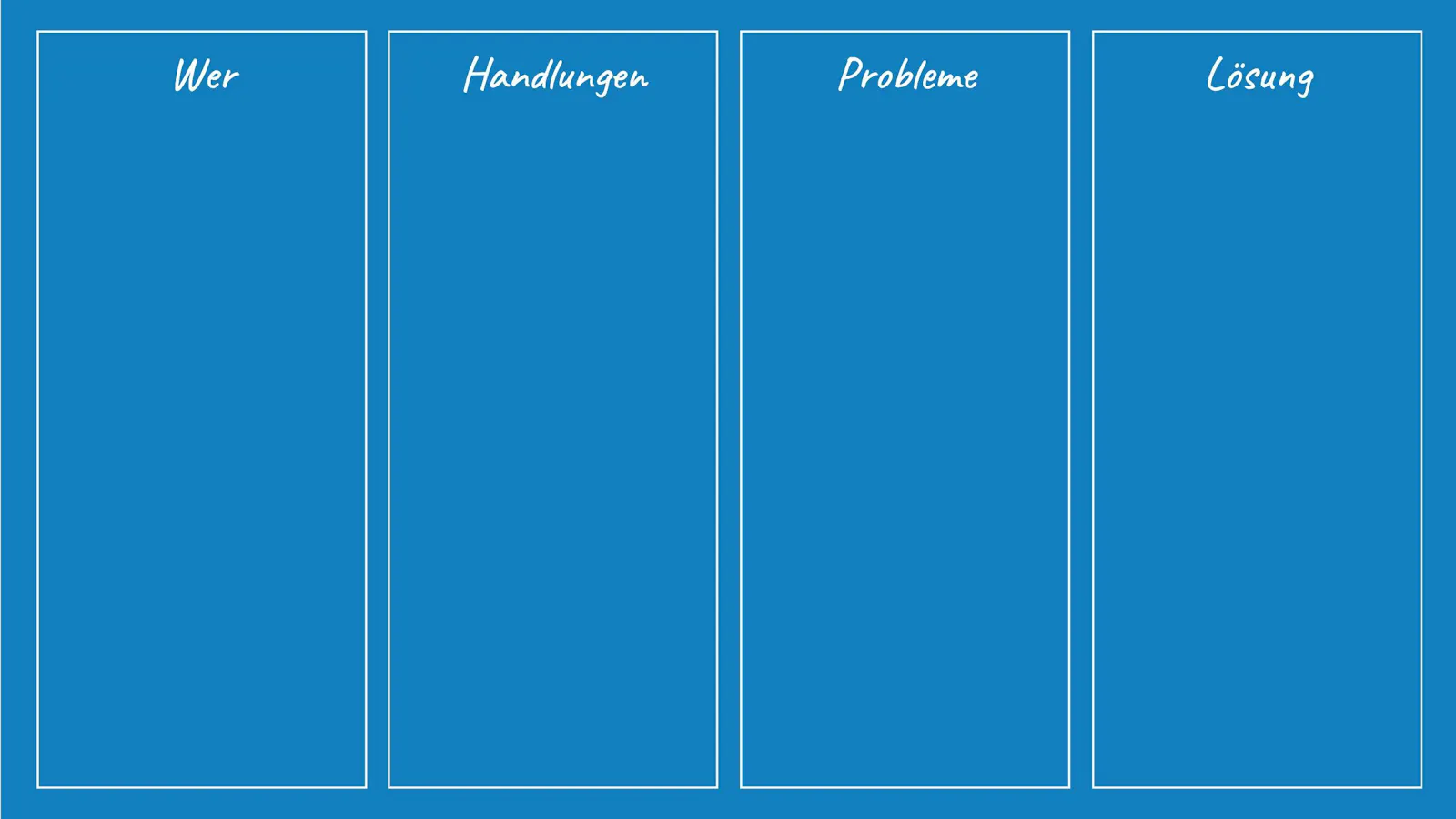 Nimm dir ein Blatt und mach vier Spalten. Anschließend füll sie – ohne schon zu hinterfragen und dich selbst zu redigieren. Und zwar von links nach rechts, beziehungsweise hin und herspringend.