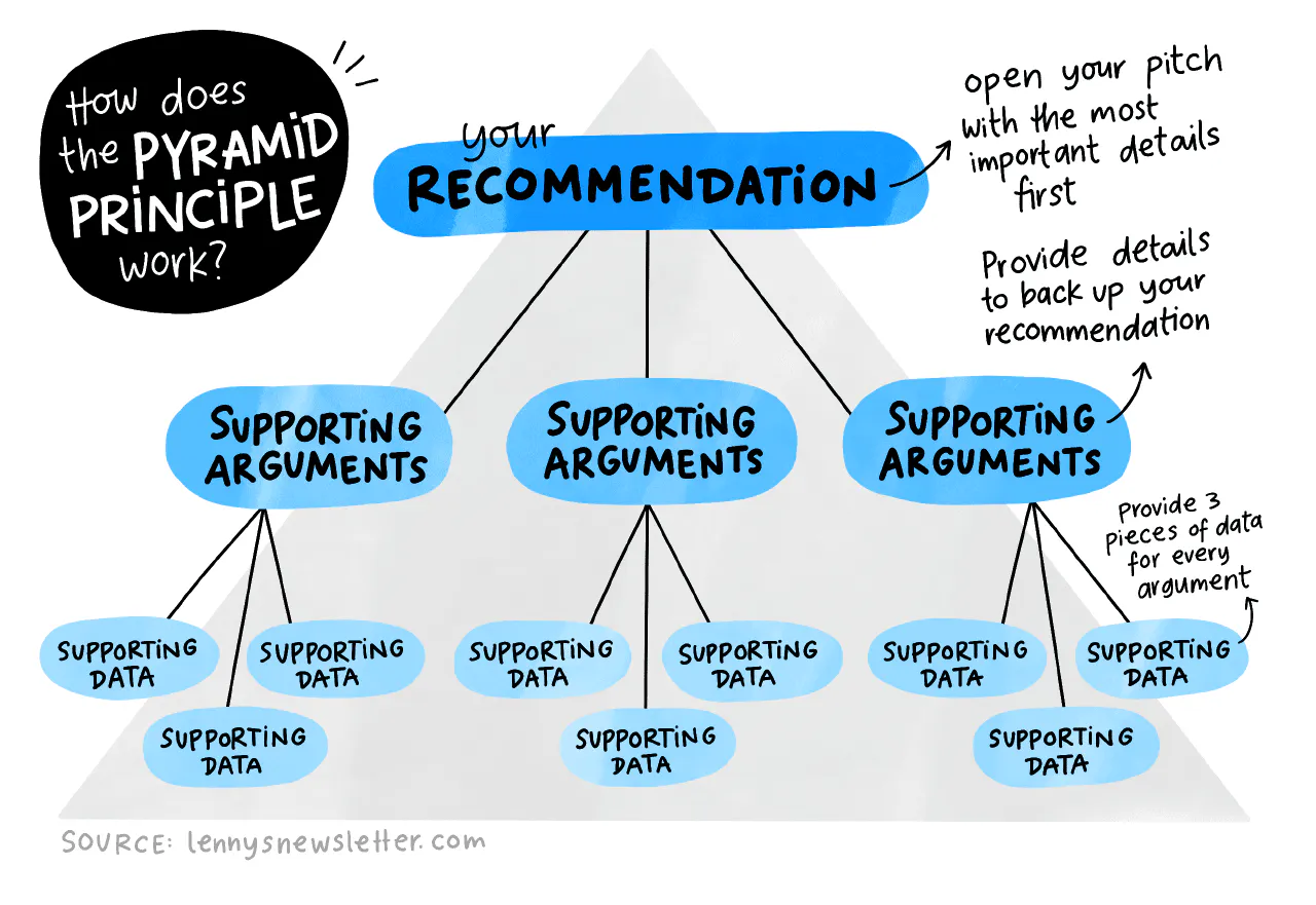 Eine andere Methode, etwas effektiv zu pitchen, habe ich gerade erst entdeckt, auch wenn sie ursprünglich aus den 80er-Jahren stammt: die Minto-Pyramide. Benannt nach der Beraterin und Autorin Barbara Minto stellt dieses Vorgehen den Pitch auf den Kopf und knallt dem Gegenüber erstmal die Lösung um die Ohren. Erst anschließend folgen drei Argumente für diese Lösung, die man zum Schluss mit Daten und Fakten unterfüttert.