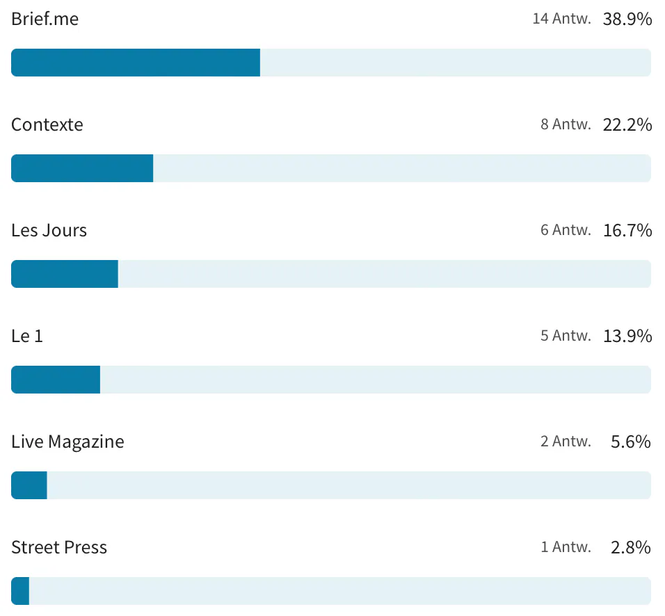 Was mich im ersten Moment überraschte, ist die Leserschaft von Brief.me (Öffnet in neuem Fenster): in der Mehrheit jünger als 35 und in der Mehrheit Frauen. Das ist jünger und weiblicher als das Publikum der meisten Medien. Gründer Laurent beschrieb das für diese Zielgruppe typische Dilemma als den Widerspruch von „Ich will mich informieren“ und „Die Emotionalität der Nachrichten stresst mich“.