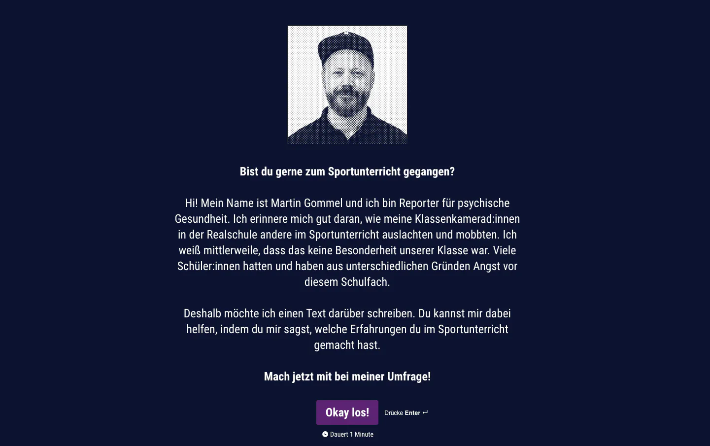 3. Um Erfahrungen zu sammeln. Mittlerweile haben wir fast 17.000 Mitglieder. Unsere Newsletter werden von einem vielfachen davon gelesen. Diese Menschen sind eine Schatztruhe an Erfahrung. Mein Kollege Martin hat unsere Leser:innen im vergangenen Jahr gefragt (Öffnet in neuem Fenster), ob sie gern zum Sportunterricht gegangen sind und welche Erfahrungen sie dort gemacht haben. Fast 7.000 Menschen haben teilgenommen. Und Martin wusste: Das Thema ist viel größer als gedacht.