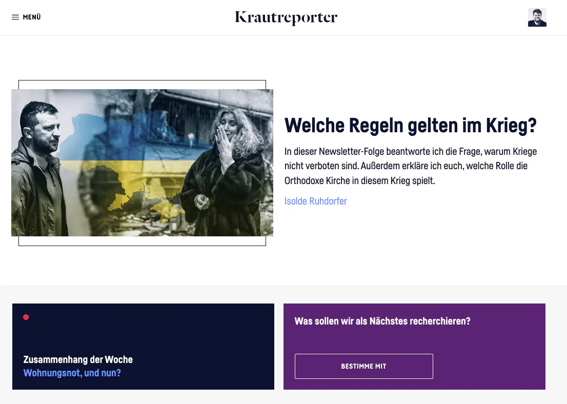1. Um Themen zu finden. Unsere Kern-Redaktion besteht aus ungefähr 15 Menschen. Journalist:innen sind zwar oft sehr von sich selbst überzeugt, aber seien wir ehrlich: Wir können gar nicht alle wichtigen Themen unserer Zeit auf dem Radar haben. Deshalb fragen wir unsere Leser:innen: Was sollen wir als Nächstes recherchieren? Diese Umfrage (Öffnet in neuem Fenster) ist uns so wichtig, dass permanent auf unserer Startseite eingeblendet wird, direkt unter unserem Aufmacher-Artikel.
