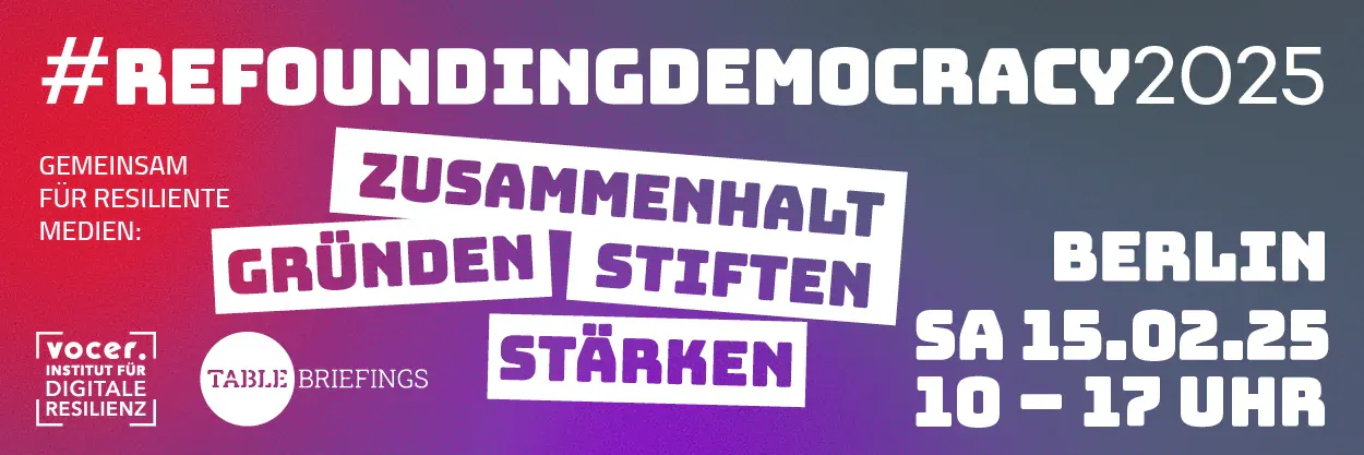 Das Vocer-Institut für Digitale Resilienz (Öffnet in neuem Fenster) untersucht seit einigen Jahren, wie Medien und Journalismus resilienter werden können in einer Gesellschaft, die zunehmend durch Krisen und krasse gesellschaftliche Wendepunkte geprägt ist. Wir fragen, ob und wie journalistische Neugründungen und Förderungen durch die öffentliche Hand zum entscheidenden Faktor für demokratische Widerstandskraft werden können – und mit welchen politischen Maßnahmen eine neue Bundesregierung diesen Prozess aktiv unterstützen sollte. Das Vocer-Institut wird deshalb gemeinsam mit führenden Köpfen aus Journalismus und Wirtschaft, Medienpolitik, Stiftungen und Zivilgesellschaft #RefoundingDemocracy 2025 initiieren.